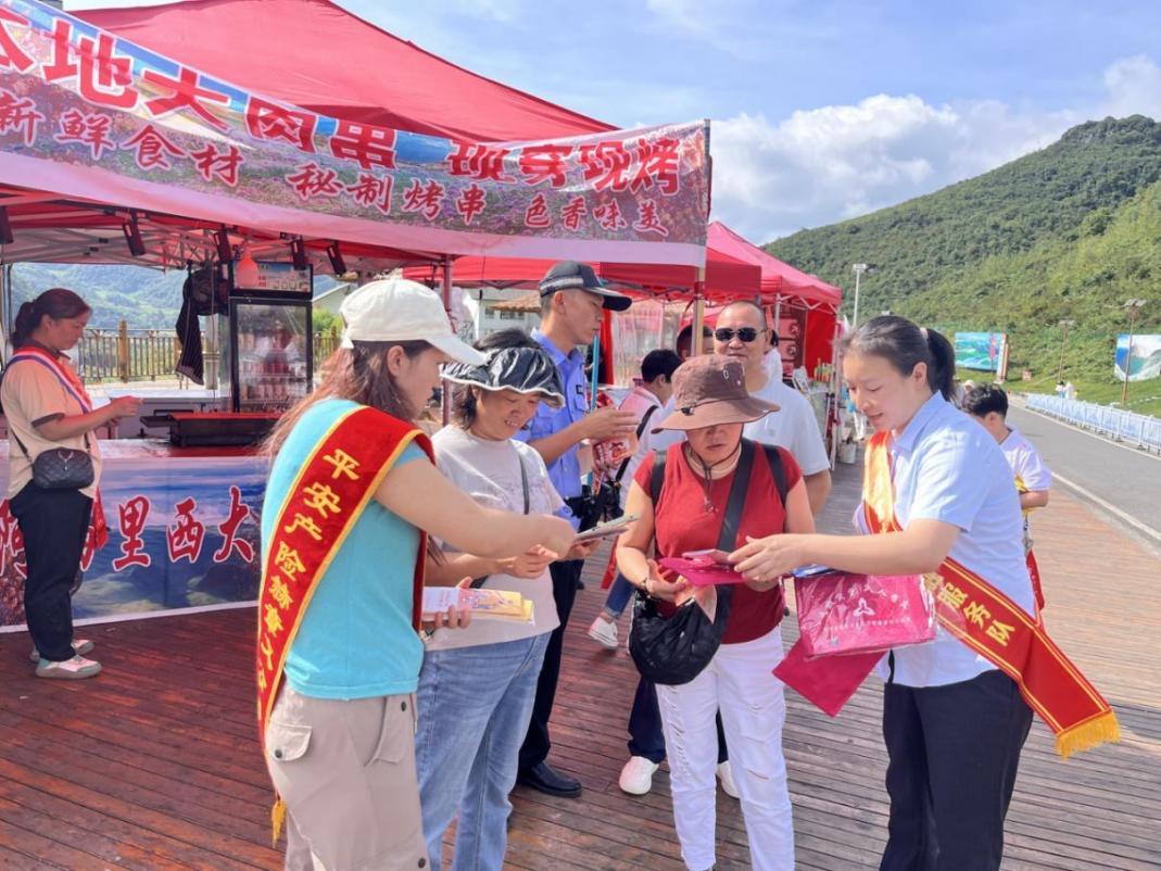 活动现场,平安产险赫章支公司宣传小组成员向游客和景区商户发放《金融知识普及》《打击保险诈骗》及《防范非法金融》等宣传折页,为公众讲解购买保险时的常见诈骗案例及维权途径,普及轻信非法金融的风险,并劝导游客尤其是老年群体要树立理性消费观念通过正规渠道购买金融产品。